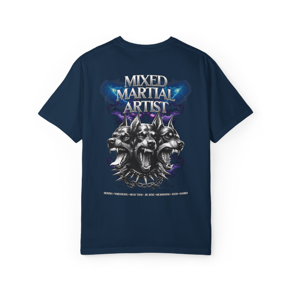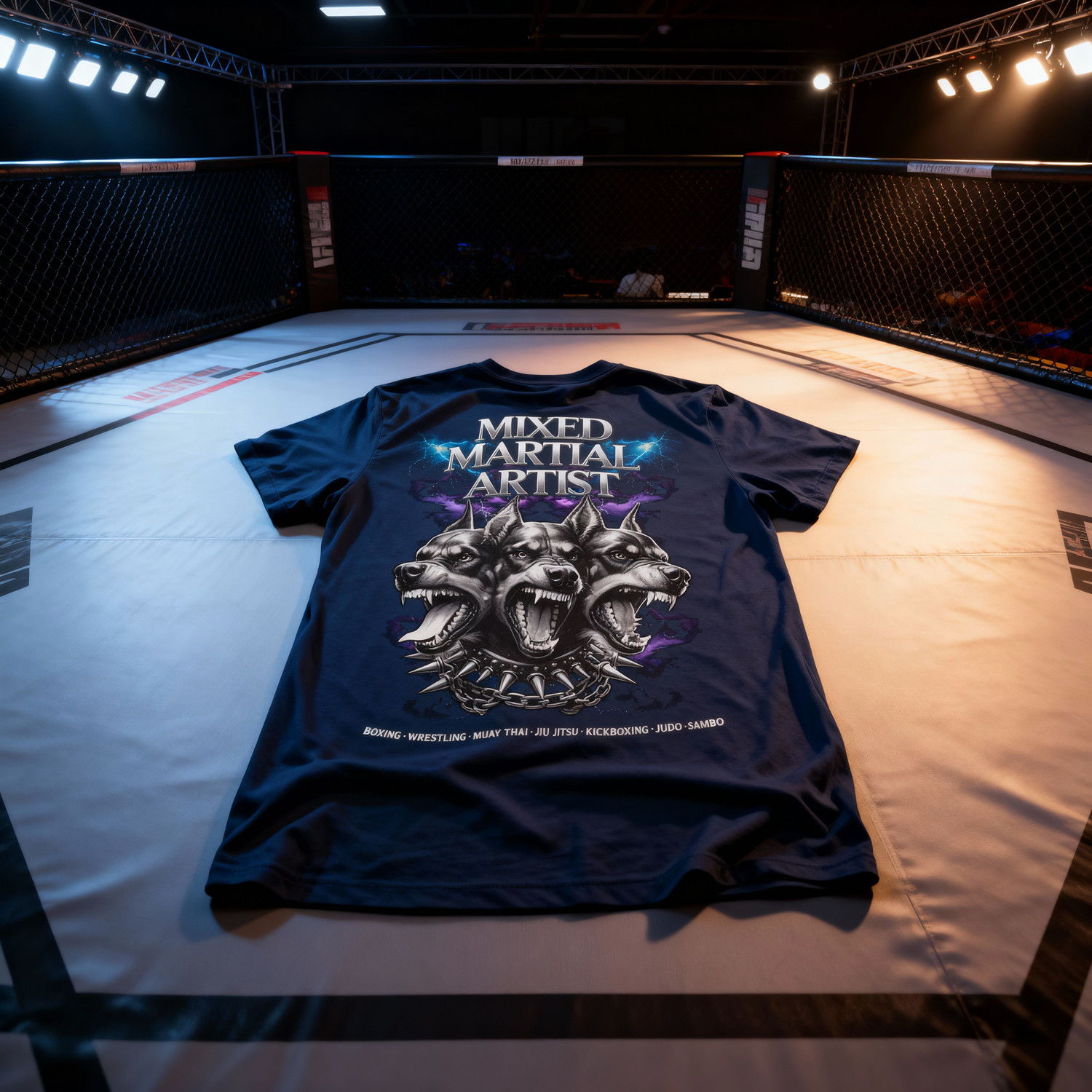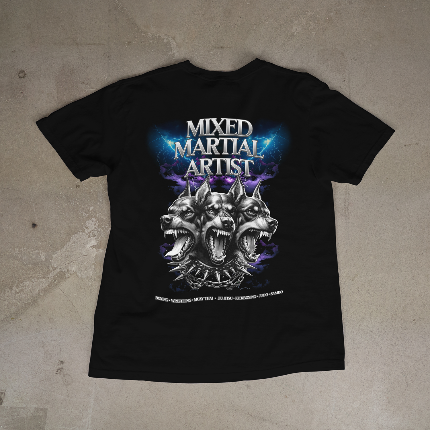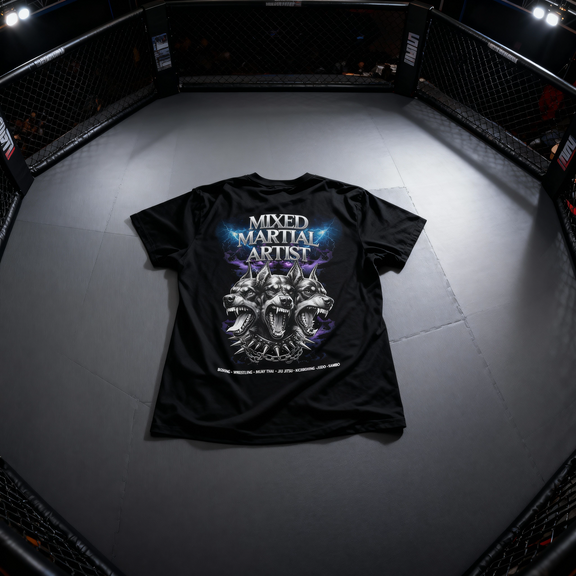 On the back, the three-headed guardian Cerberus stands as a symbol of the MMA fighter’s trinity: body, mind, and spirit in unified motion.