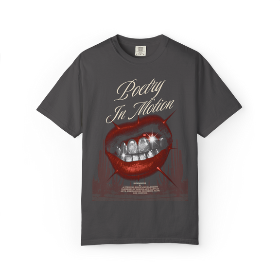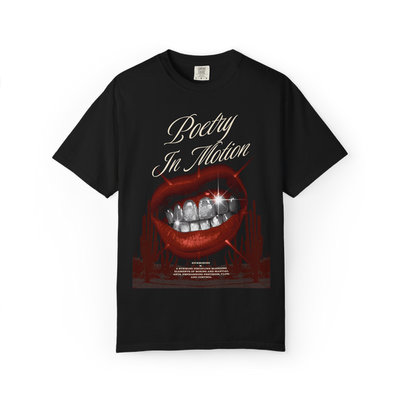At the center, gleaming silver teeth emerge from deep red lips — a bold statement on balance between aggression and artistry. The phrase “Poetry in Motion” rises above the image in elegant cursive, echoing the grace of a trained fighter’s flow. Below, the Kickboxing definition grounds the piece: “A striking discipline blending elements of boxing and martial arts, emphasizing precision, flow, and control.”